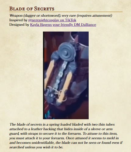When you want to live out your Assassin’s Creed dreams in a slightly more fantasy vibe then look no further. I too like to keep my stabby stabbies hidden until its time to use them. Who doesn’t need something to take with them into a ball in case hinky things goes down?