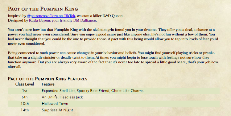 So some of ya’ll might remember one Halloween long ago when I was watching a certain ‘Nightmare Before Christmas’ when I was like - “I could make so many warlock patrons from characters in this movie.” Then proceeded to do just that with the most iconic figure in the movie. This fits right into any character that gives those good old spook vibes, any one shots happening during this month of spook, or just to give some dark twists to your normal warlock options.