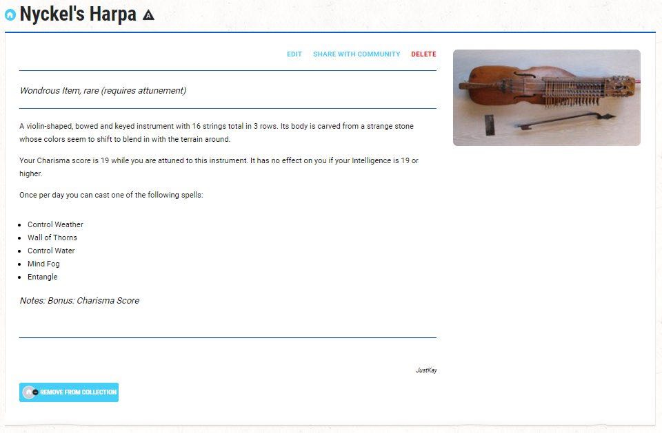 Crafted by a master fae artist this instrument sings a strange melody that seems to bend the world around it to the musicians’ advantage. This instrument can provide an amazing bit to your backstory or an amazing journey for your character to find an instrument whose music matches your soul. It was first created by a master tinkerer who produced many magical musical items that have been scattered throughout the lands, and a few throughout time.
