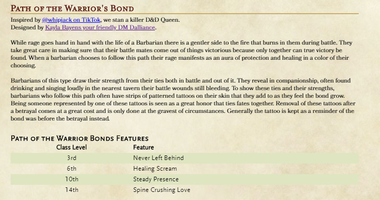 Some of you may know that I take making random fun 5e things very seriously so when Whipjack on Tiktok joked about wanting to play a barbarian that healed their friends with the power of their rage I couldn’t help but just know what I had to do. So was born one of my favorite subclasses the Barbarian’s ‘Path of the Warrior’s Bond’. A fun way to keep your rage but be able to make sure your friends stay up even as you tank. They even played using the subclass early on in their podcast in Arc 2: Lovejoy’s Four.